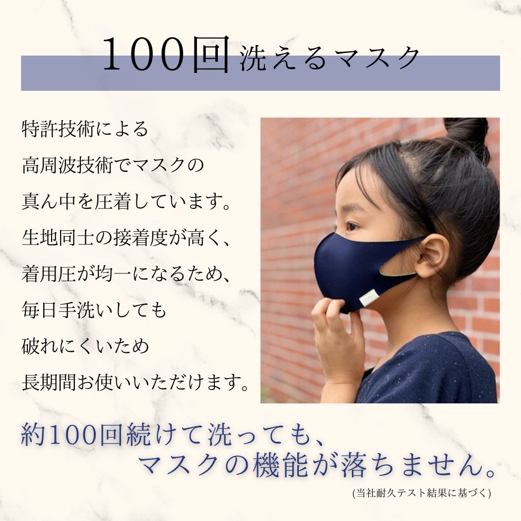 約100回洗っていただけます(当社耐久テスト済み)高周波技術でマスクの真ん中を着圧しているため毎日手洗いしても破れにくい仕様で長期間お使い頂ける環境にも配慮したい方にオススメです。
