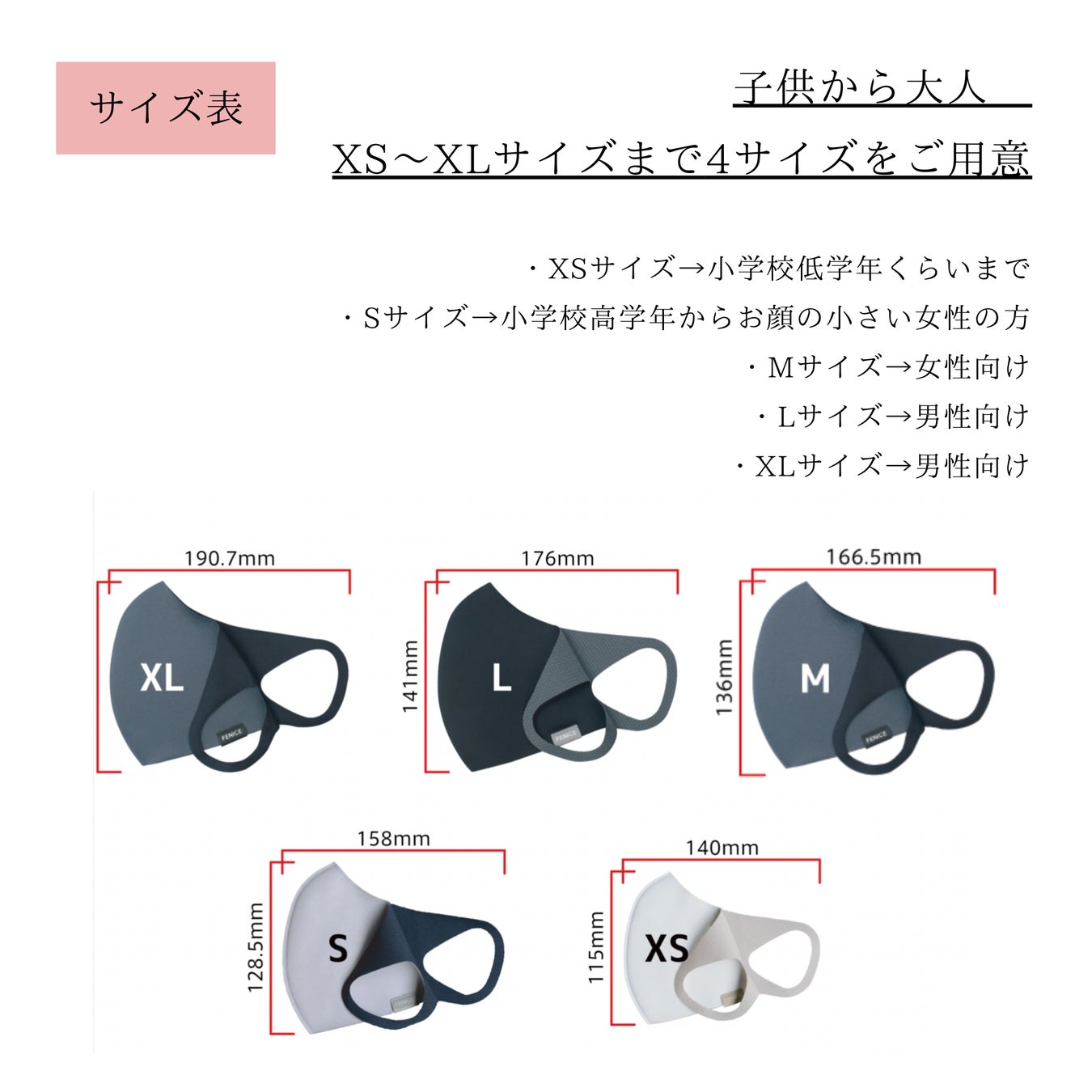 FENICEのマスクはXS(お子様サイズ)〜XLまで幅広くご用意しております。